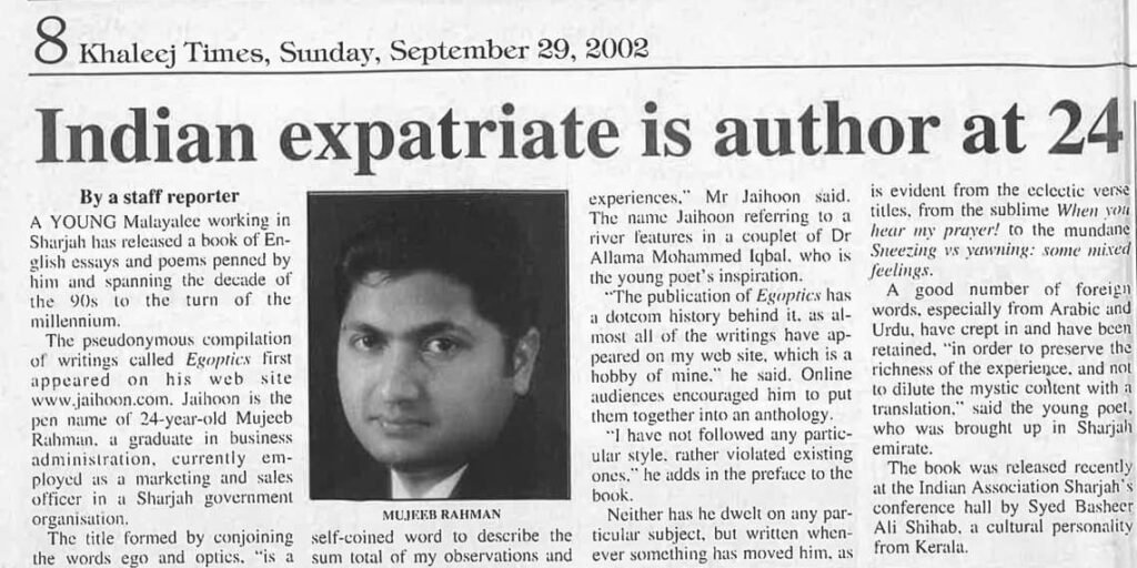 Khaleej Times reports on Mujeeb Jaihoon, 24, who published Egoptics, a debut anthology of essays and poems reflecting his experiences.
